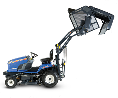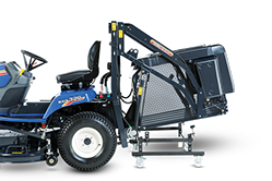 ISEKI Grasaufnahme für SXG 323 und SXG 326 mit Hochentleerung 600L. Hydraulische Betätigung vom Fahrersitz zum Entleeren und Verladen auf Anhänger oder Container.