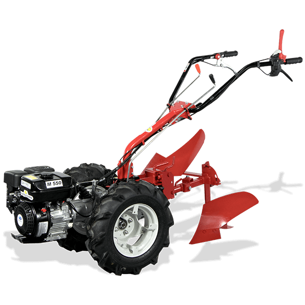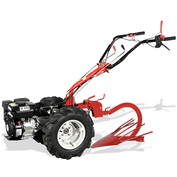 Die M550 ausgerüstet mit einem Robin 4-Takt MotorModell SP 170, mit 169 ccm, OHC Technik,Zahnradschaltgetriebe mit 3 Vor- und 3 Rückwärtsgängen,1. Gang 1,1 km/h, 2. Gang 2,6 km/h, 3. Gang 4,3 km/h*( * Geschwindigkeiten mit 16x6,50-8 AS Räder )Führungsholm, gummigelagert, 180° schwenkbar, höhenverstellbar, seitenverstellbar bei Frontanbaugeräten. Starre Radachse, patentierte Kupplung Fahrantrieb und Anbaugeräte am Holm separat schaltbar,Einfaches und werkzeugloses Wechselnder Anbaugeräte durch Schnellkupplung. Antrieb der Anbaugeräte über Zapfwelle,Gangunabhängige Zapfwelle mit 965 U/min Preis Grundmaschine ohne Räder und Anbaugerät