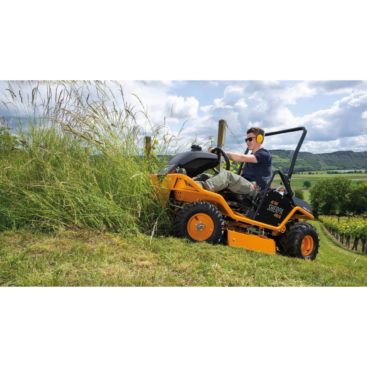 Die aufrechte Sitzposition mit gestreckten Beinen ermöglicht ein komfortables Arbeiten für Bediener mit einer Körpergröße bis zu 1,90 m. Ein umlaufender Stahlrohrrahmen dient als Trägerbasis für alle Anbauelemente. Der Sitz lässt sich individuell für jeden Benutzer in Länge und Federungskomfort einstellen. Ein ausgeklügeltes Sitzfederpaket mit Gasdruckdämpfer, Federelementen und Elastomeren verhindert ein „Durchschlagen“ der Federung. Wesentlich für die Geländegängigkeit ist der tiefe Schwerpunkt und die tiefe Sitzposition des Fahrers in der Maschine. Zu den Seiten hin schützen Astabweiser den Benutzer vor Gestrüpp. Der klappbare Bügel bietet nach hinten zusätzlichen Schutz. Durch die getrennte Zu- und Abluftführung der Motor- und Hydrostatölkühlung wird vermieden, dass eine der beiden Komponenten die warme Abluft der anderen ansaugt und zum Kühlen nutzt. Durch dieses getrennte System wird eine Überhitzung sicher vermieden. Der AS 940 Sherpa 4WD XL ist für den professionellen Dauereinsatz geeignet.